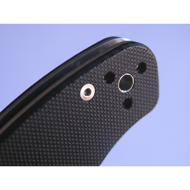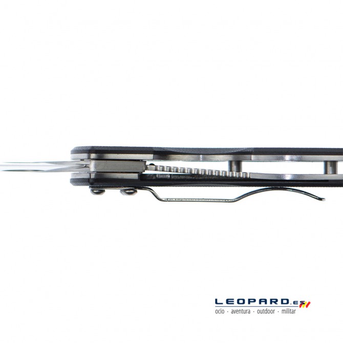 Las cachas de color negro de esta navaja están fabricadas en G10, un tipo de fibra de vidrio ultra-resistente que se forma a través de la agrupación de miles de capas que se someten a alta presión.