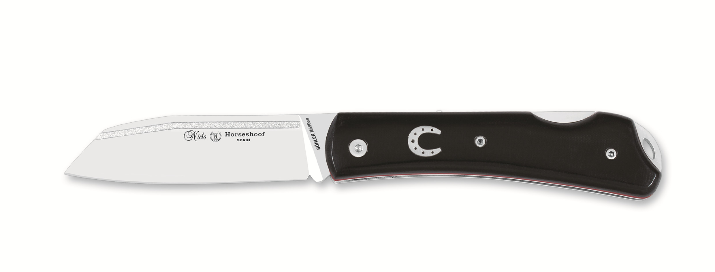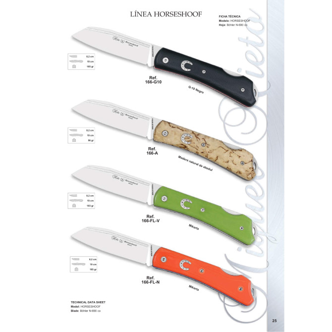 Otra de las colecciones que saca Miguel Nieto al mercado es la serie Horseshoof. En este caso es el modelo 166-M, con hoja de 8 cm de acero inoxidable Böhler N690co y las cachas de micarta negra, con separadores en color rojo y una herradura también en acero inoxidable. Incluye sistema de bloqueo Back Lock.