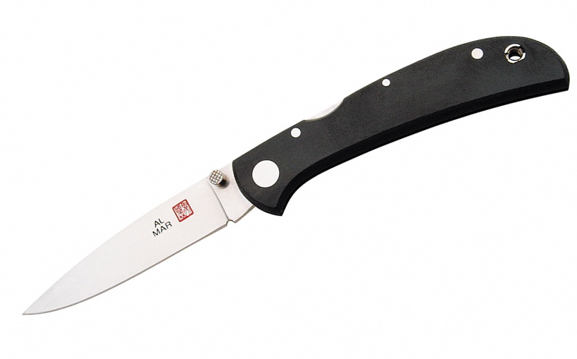 AM3B2 NAVAJA AL MAR FALCON LOCKBACK BLACK MICARTA Al Mar Falcon Black Micarta. 4" closed lockback. Satin finish AUS-8 stainless drop point blade with thumb stud. Black linen micarta handles with lanyard hole. Features the Al Mar front lock system which allows the user to open and close with one hand and the Al Mar Pro-Clip system which allows user to reverse the pocket clip. Weighs 1.25 oz. Country of Origin: JAPAN