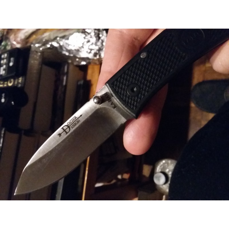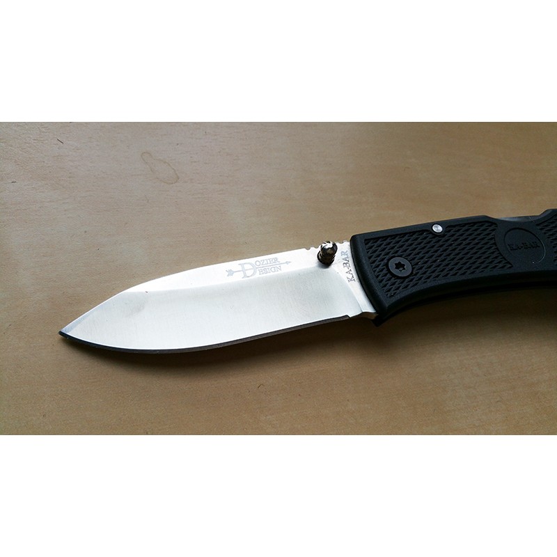 Ka-bar Dozier Folding Hunter. 4 1/4" closed lockback. AUS-8A stainless drop point blade with thumb stud. Black checkered Zytel handles with lanyard hole. Reversible pocket clip. Designed by Bob Dozier.
