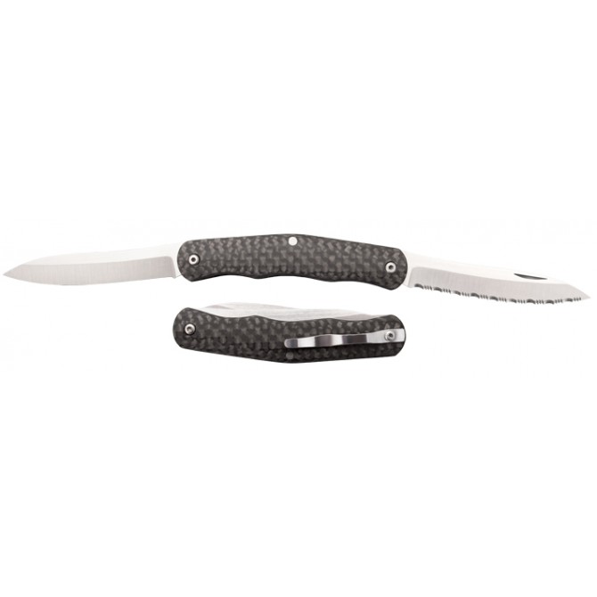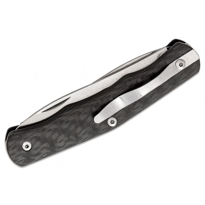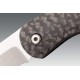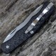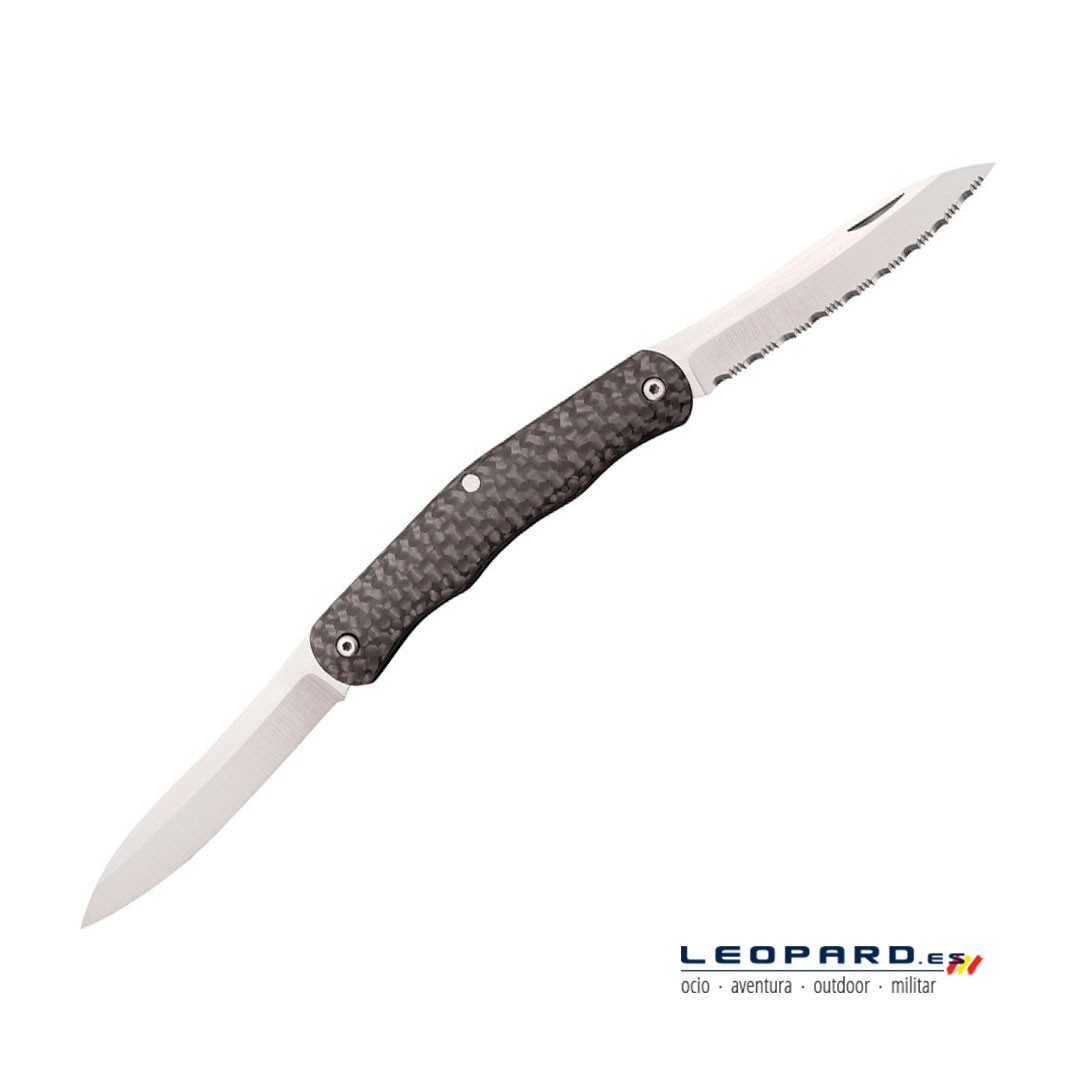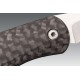 Las cachas de esta navaja están fabricas en fibra de carbono, un material compuesto por hebras de carbono que se entrelazan y curan a alta presión. El resultado es un material resistente y ligero que ofrece una gran durabilidad ante impactos o temperaturas extremas.