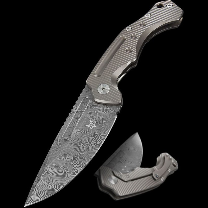 Navaja Fox diseñada por Boris Manasherov con hoja fabricada en acero Damasco y cachas en titanio de color azul. Largo total: 21,7 cm Largo de la hoja: 9,5 cm Grosor de la hoja: 4 mm Tipo de acero: Damasco Tipo de Bloqueo: Frame Lock Apertura: Manual. Incluye funda de piel marrón.