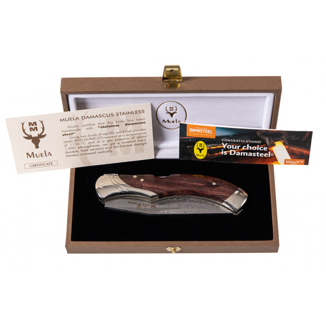 La característica principal de la hoja de la navaja es el acero utilizado para su fabricación. Los desarrolladores de Muela han escogido acero de Damasco inoxidable en el que se han utilizado dos aceros pulvimetalúrgicos (RWL34 y PMC27) para conseguir una resistencia a la rotura dos veces mayor.