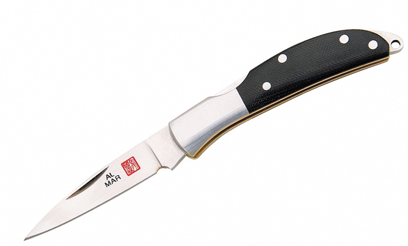 Item: AM1001BM NAVAJA Al Mar Osprey Black Micarta. 2 1/4" closed lockback. AUS-8 stainless drop point blade. Black linen micarta handles with a brushed stainless bolster and keyring attachment. Brown leather slip pouch. Weighs 0.5 oz. Country of Origin: JAPAN