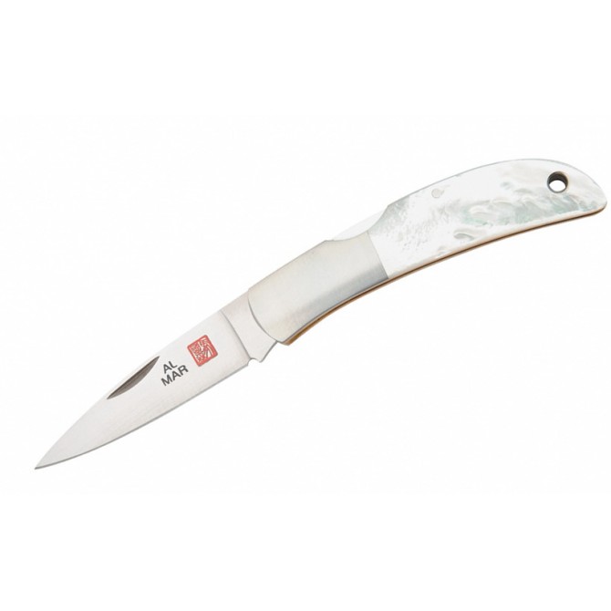 AM1002P NAVAJA AL MAR HAWK LOCKBACK PEARL HANDLES Al Mar Hawk Mother of Pearl. 3 1/4" closed lockback. AUS-8 stainless blade. Mother of pearl handles with brushed stainless bolster. Lanyard hole. Brown leather slip pouch. Weighs 1.5 oz. Country of Origin: JAPAN