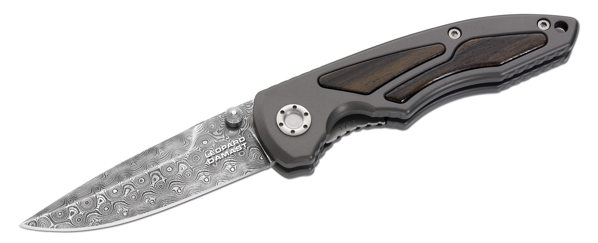 Boker Damascus Linerlock. 4 3/4" closed. Damascus steel drop point blade with ambidextrous thumb studs. Blade steel is from the German Leopard I battle tank. Gray finish 6061-T6 aluminum handles with desert ironwood inlays. Lanyard hole. Reversible stainless pocket clip. Comes in wood display box.
