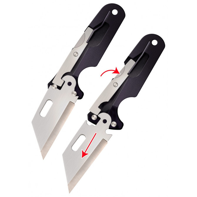La mayor particularidad de este modelo diseñado por Cold Steel llega en la hoja, ya que incorpora una tecnología revolucionaria para realizar el cambio de la misma y poder variar entre varios estilos.