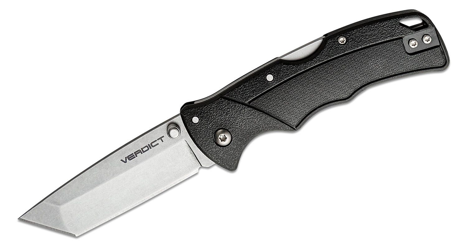 Leopard ya tiene a la venta la colección de navajas tácticas modelo Verdict, fabricadas por Cold Steel. Este modelo incluye hoja tipo tanto fabricada en acero inoxidable 4116, acabado lavado a la piedra, y las cachas son de GFN, con un buen agarre y además tiene agujero para cordón fiador. Incluye clip de bolsillo.