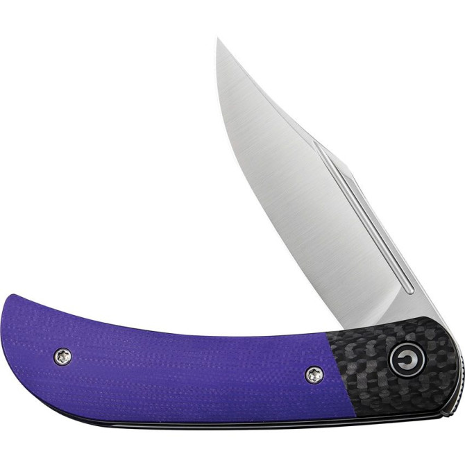 Los cabezales están hechos de fibra de carbono, que le otorga contraste con respecto al color púrpura de las cachas y un acabado elegante. Posee as u vez un clip para transportarlo de forma más cómoda y ligera.