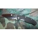Navaja económica de tamaño medio, hoja de acabado satinado con un borde parcialmente dentado y cachas en G-10 negro.