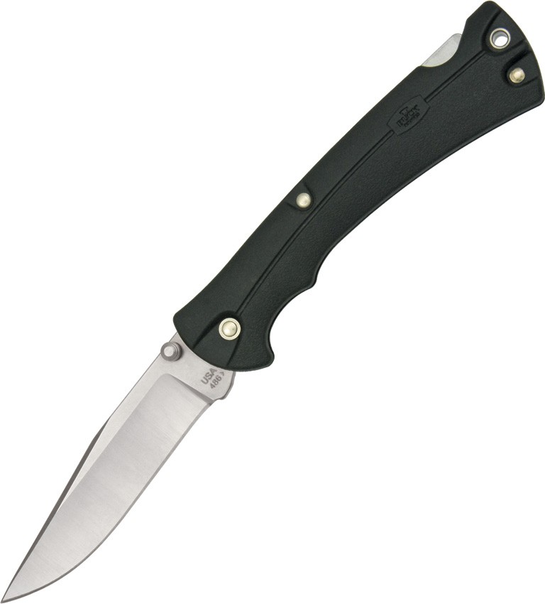 Buck Folding Bucklite MAX Large. 5" closed lockback. 420HC stainless drop point blade with dual thumb studs. Black glass reinforced nylon handles. Stainless pocket clip.