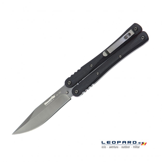 Novedad Black Fox navaja mariposa (Butterfly). Hoja fabricada en acero 440 acabado color negro. Cachas fabricadas en G10 de color negro. Incluye clip. Longitud total: 22,5 cm Longitud de hoja: 10 cm Longitud cerrada: 12,5 cm Grosor: 3 mm Peso: 190 gr.