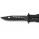 "Vista general de la hoja de la navaja mariposa K25 negra, como se puede ver el filo de la hoja llega desde las cachas hasta la punta de la hoja, la hoja es una pasada de bonita."