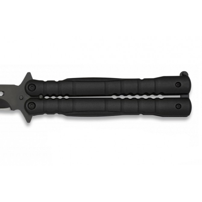 "Vista general del seguro-cierre de la navaja mariposa K25 negra, el seguro es fuerte y cierra las cachas fuertemente lo que hace difícil que se abra en la mano."