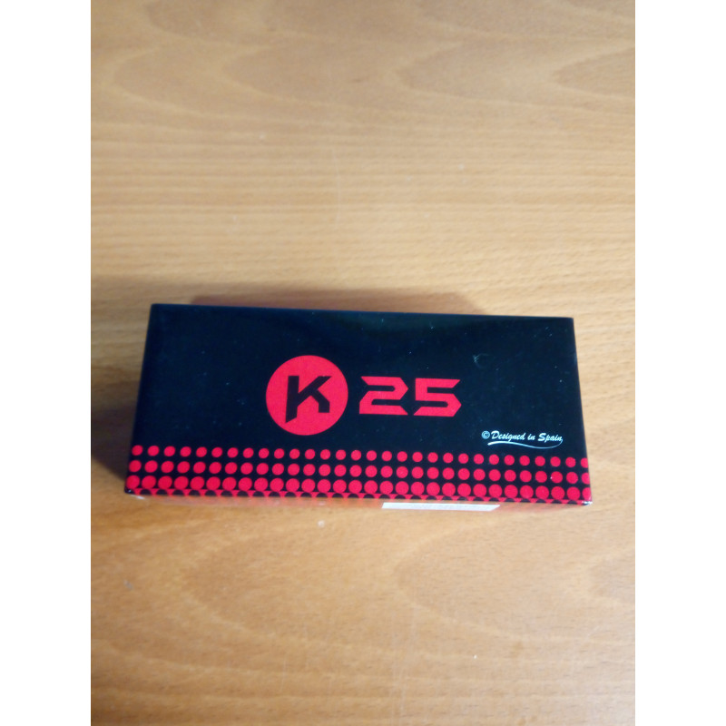 "Vista general de la caja original de la navaja mariposa K25 negra, llegó en perfecto estado sin deformaciones, arrugas o desperfectos. Envío en 24h."