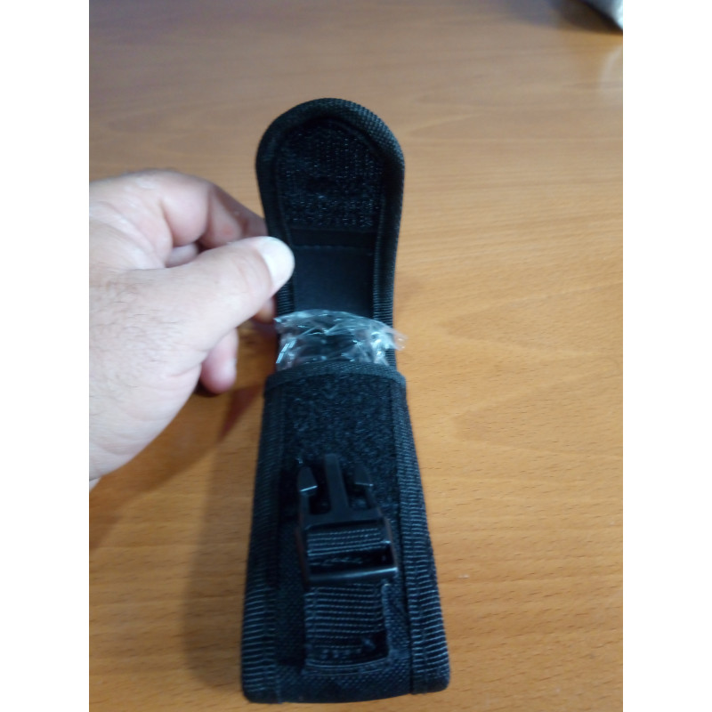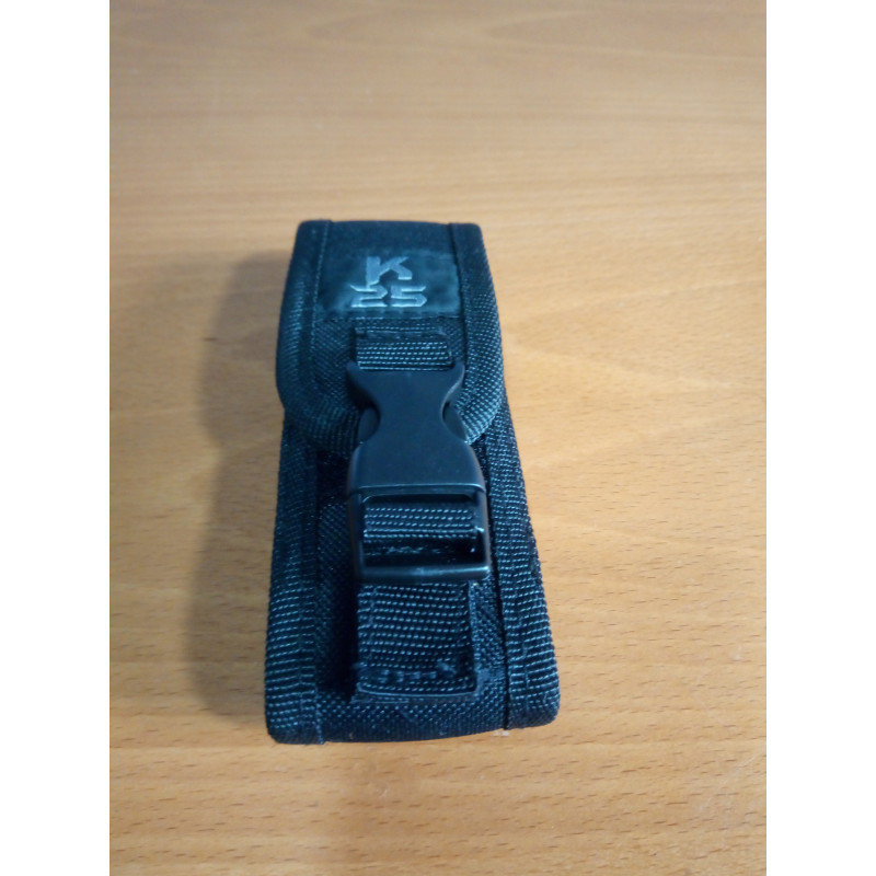 "Vista general de la funda de la navaja mariposa K25 negra, como se puede ver la funda está fabricada en nylon negro, bien cosida y rematada, tiene un cierre tipo clip en la lengüeta."