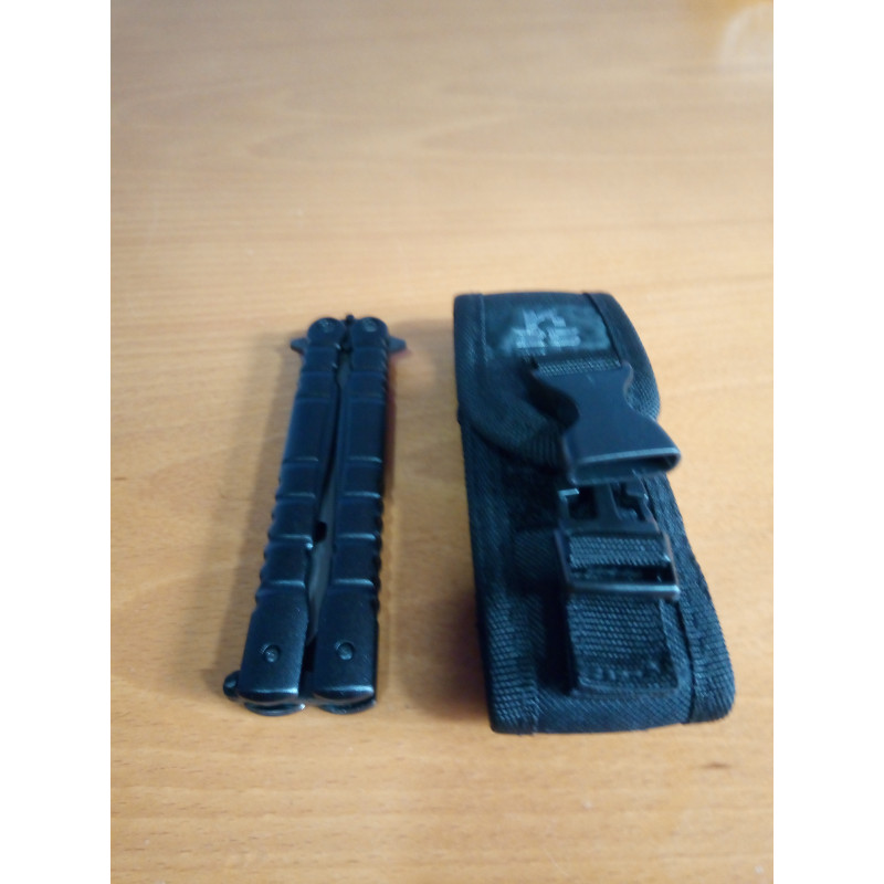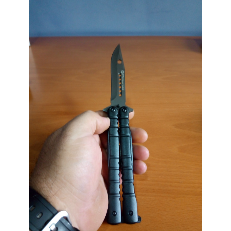 "Vista general de la funda y la navaja mariposa K25 negra abierta, como ya he dicho anteriormente la mariposa es una pasada de bonita, ergonómica y ligera."