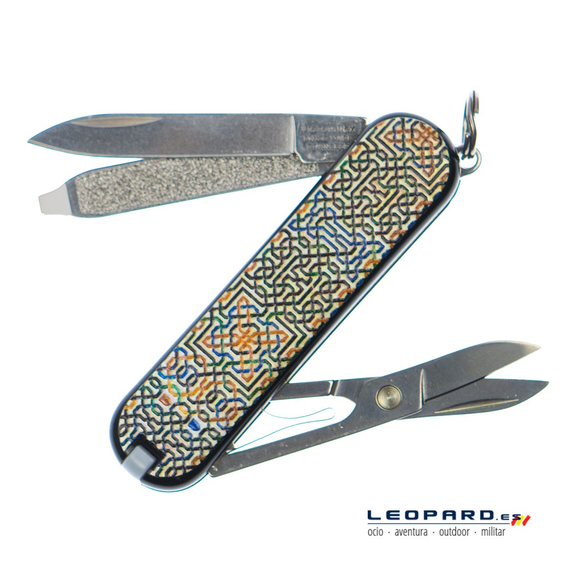La prestigiosa marca Victorinox siempre se caracteriza por la contrucción de sus navajas con los mejores materiales. Pero la identidad de esta pieza reside en el acabado de sus cachas. Esta pieza forma parte de una colección especial que homenajea los motivos decorativos de la Alhambra de Granada.