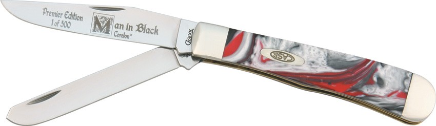 Case Trapper. 4 1/8" closed. Stainless clip and spey blades. Man in Black (gray, black, red and white) Corelon handles with nickel silver bolsters and inlay shield. Master blade features series etch. Limited edition of 500 produced.