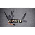 La empuñadura de este modelo multiusos está construida en ABS-Cellidor, una combinación de polímeros de altas prestaciones que confieren a la navaja una buena resistencia al impacto con muescas, a la abrasión y al rayado. Además, otra de las características de este material es su buena tenacidad, rigidez y dureza. Con un bonito acabado en camuflaje.