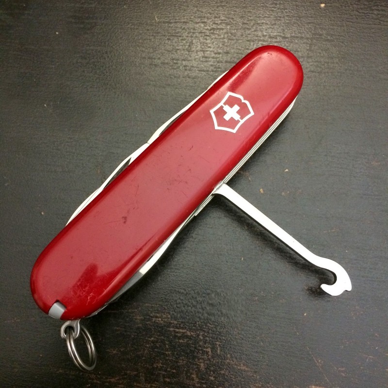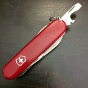 el abrebotellas tiene el diseño clasico de victorinox con un pelacables en su base y destornillador en la punta