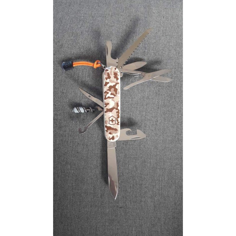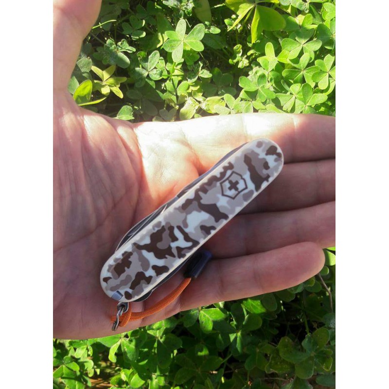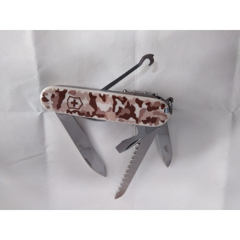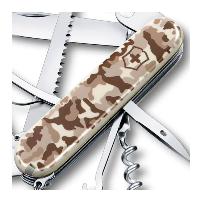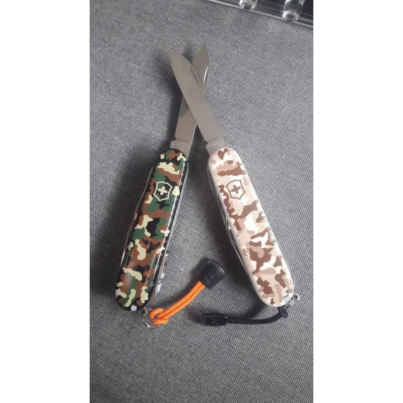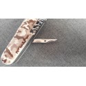 Como se puede observar,el escudo en esta Victorinox viene de color marrón,para no desentonar con estas bonitas cachas de camuflaje del desierto. Una Victorinox preciosa que recomiendo a todo el mundo