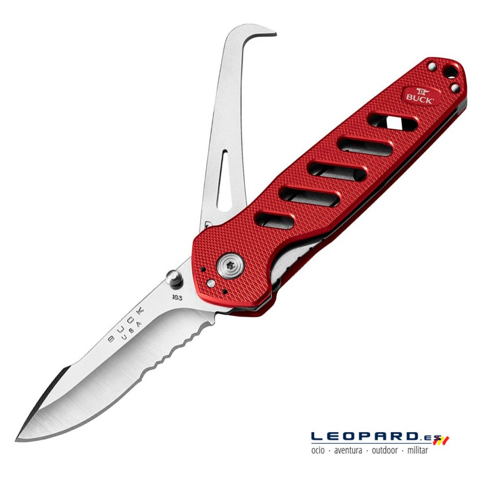 Navaja Buck con hoja de acero 420HC parcialmente serrada diseñada para todo tipo de actividades tanto en el campo como en la vida cotidiana. Cachas de aluminio anodizado color rojo. Incluye agujero para cordón fiador, clip de bolsillo. Incluye funda de nylon.