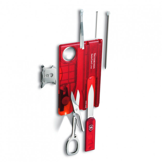 La mayoría de situaciones que surjan en el día a día podrán ser solventadas gracias a las 13 utilidades de esta Swisscard Lite rojo translúcido. Destacan la linterna LED, lupa, tijeras y hoja abrecartas.