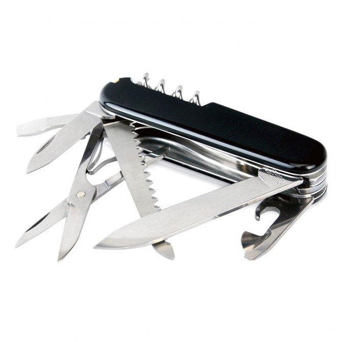 La navaja Huntsman Negro es la herramienta ideal para el uso diario y para su utilización en montaña o campo debido a la incorporación de la sierra para madera entre sus funciones. Además, su pequeño tamaño y peso la convierte en un producto exclusivo y práctico.