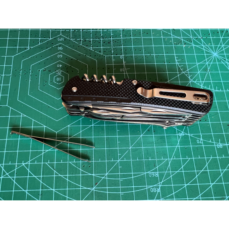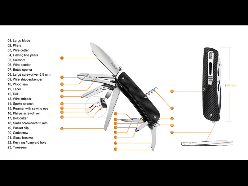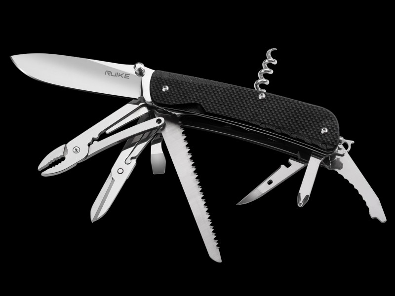 Navaja Multiusos Ruike con 23 usos fabricada con acero Sandvik 12C27 acabado pulido a espejo y cachas en G10. Este modelo cuenta entre otros usos con Navaja, alicate, tijeras, sierra para madera, rompecristales, clip, pinzas, sacacorchos, abrebotellas, destornillador grande 6,5 mm, pelacables, doblador de alambre, corta cinturones, destornillador pequeño 3 mm, anilla, etc. Es la multiherramienta perfecta para las escapadas a la montaña, las actividades outdoor y para los servicios de emergencia y rescate.