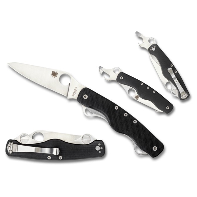 Pequeña multiherramienta de rescate de la prestigiosa marca Spyderco 2018. Cuenta con una hoja principal fabricada en acero inoxidable 8Cr13MoV y aparte tiene abrelatas plegable, un pequeño destornillador y abrebotellas. También incorpora un destornillador grande con pelacables. Puede abrirse fácilmente con una sola mano, gracias a los 3 orificios de marca registrada que posee. Cachas fabricadas en G10. Incluye clip reversible de 2 posiciones.