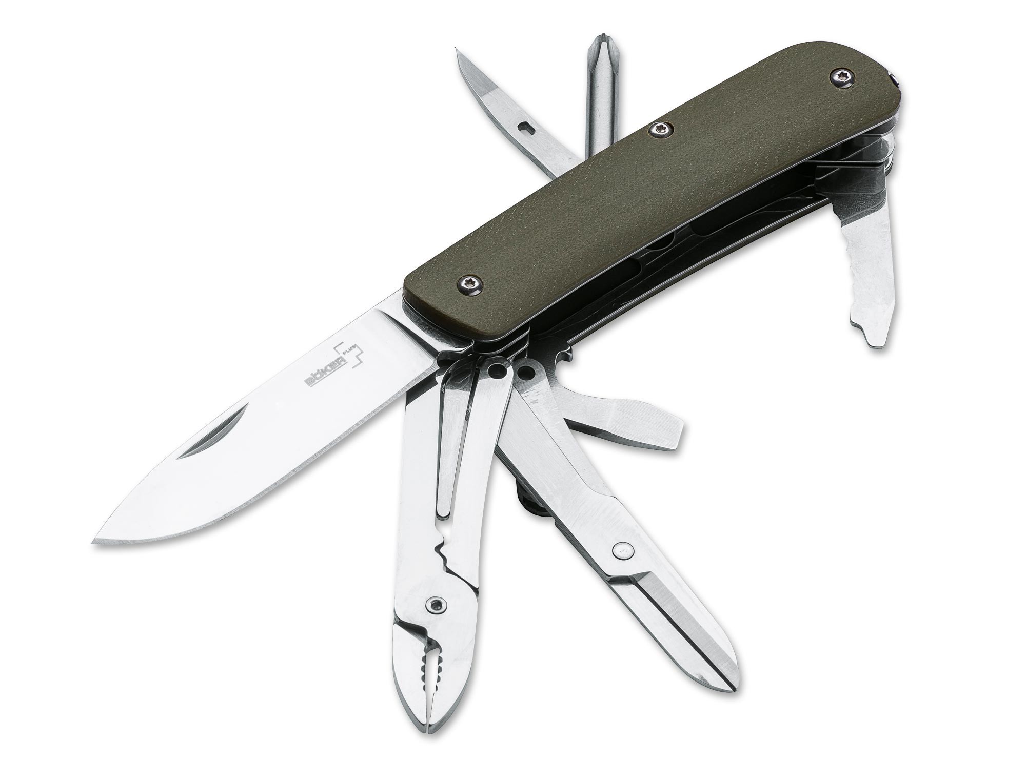 Navaja Multiusos Boker con 12 usos fabricada con acero Sandvik 12C27 y cachas en G-10 Verde. Este modelo cuenta con Navaja, rompevidrios, clip, destornillador plano, abrebotellas, destornillador plano fino, corta cinturones, tijeras, punzón, alicates, destornillador de estrella.