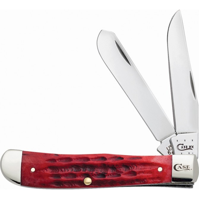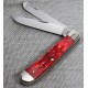 Navaja Case con dos hojas. La hoja principal tipo clip point y la secundaria tipo spey. Cachas fabricadas en hueso de color granate.