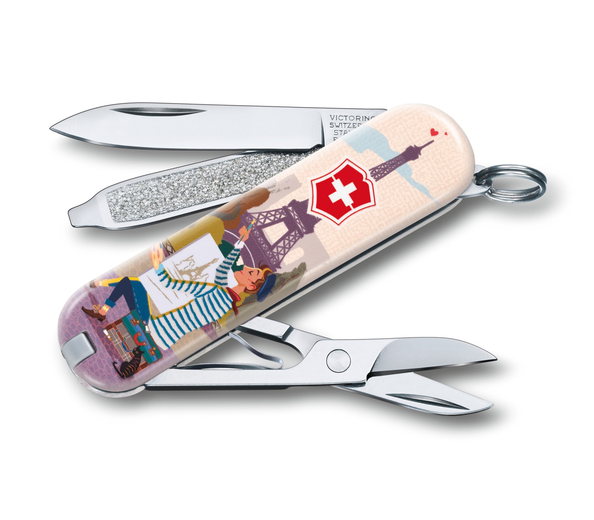 Victorinox saca al mercado la nueva navaja de edición limitada colección SD 2018 modelo Gaza Paris Love, imprescindible para los coleccionistas. La colección de este año está inspirada en los "lugares más bellos del mundo". Se seleccionaron de entre las 878 ideas aportadas de 62 países, los 10 diseños más votados por los usuarios. Esto fue el resultado del concurso de diseño "Classic Limited Edition" de este año. 7 Usos: 1. Navaja 2. Lima de uñas con 3. – Destornillador 4. Tijeras 5. Anilla 6. Pinzas 7. Palillo.
