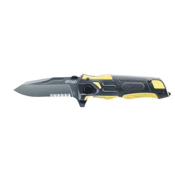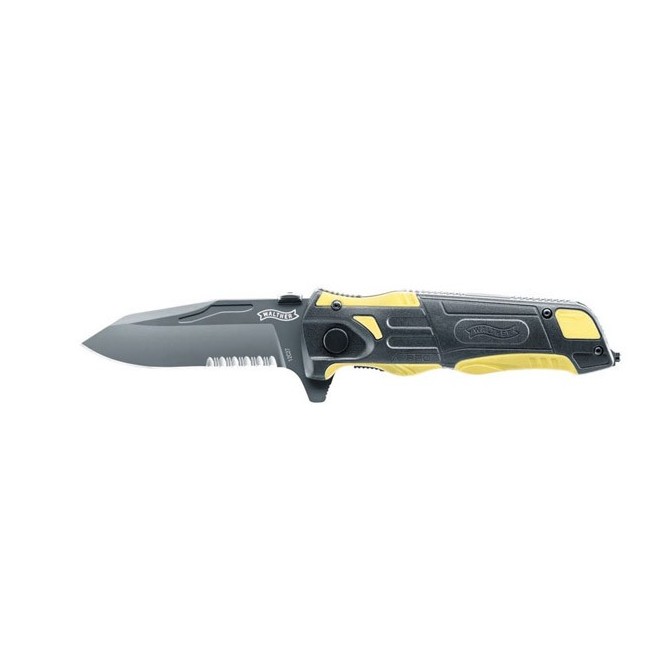 Navaja Rescate Walther PRO amarilla. Longitud total: 21,8 cm Longitud de la hoja: 9,0 cm con ala de protección para los dedos. Filo parcialmente serrado. Acero: Sandvik 12C27 acabado en negro Cachas: G10 Peso: 208 g Rompe cristales de tungsteno. Incluye funda nylon con clip para cinturón.