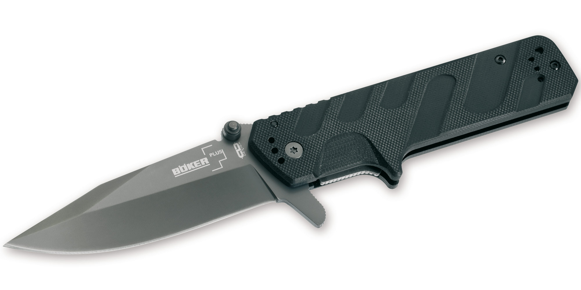 Boker Plus CLB Direkt Tactical Folder. 4 3/4" closed. Titanium coated 440C stainless blade with dual thumb studs and extended tang. Black G-10 handles. Four way reversible pocket clip allows various carrying options.