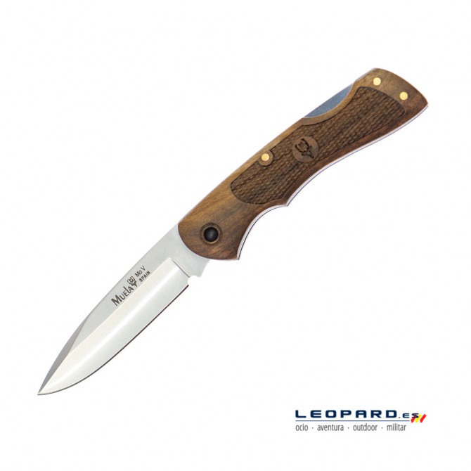 Navaja española Muela con hoja fabricada en acero inoxidable MoVa. Bloqueo Back Lock y cachas fabricadas en madera de nogal. Incluye funda de cordura de color negro.