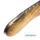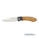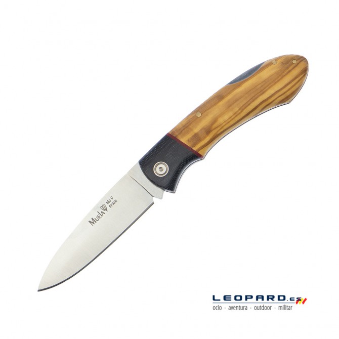 Navaja española artesana fabricada por Muela serie GT. Hoja de 8,5 cm fabricada en acero inoxidable MoVa (1.4116). Cachas fabricadas en micarta negra y madera de olivo. Bloqueo Back Lock. Incluye funda de nylon.