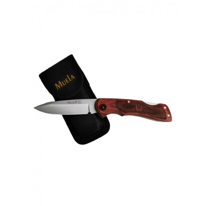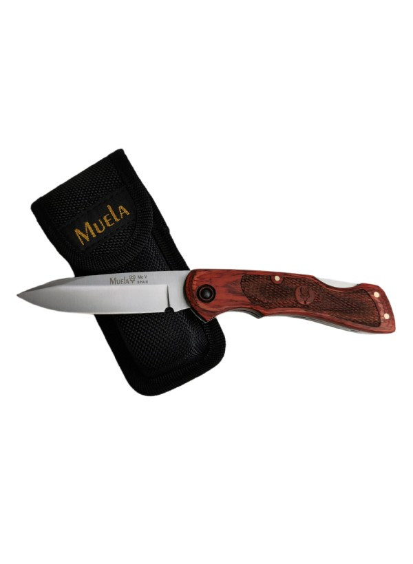 Navaja española fabricada por Muela serie BT, modelo BX-8NL con hoja fabricada en acero inoxidable MoVa. Bloqueo Back Lock y cachas fabricadas en madera prensada coral y virola de alpaca. Incluye funda de cordura de color negro.