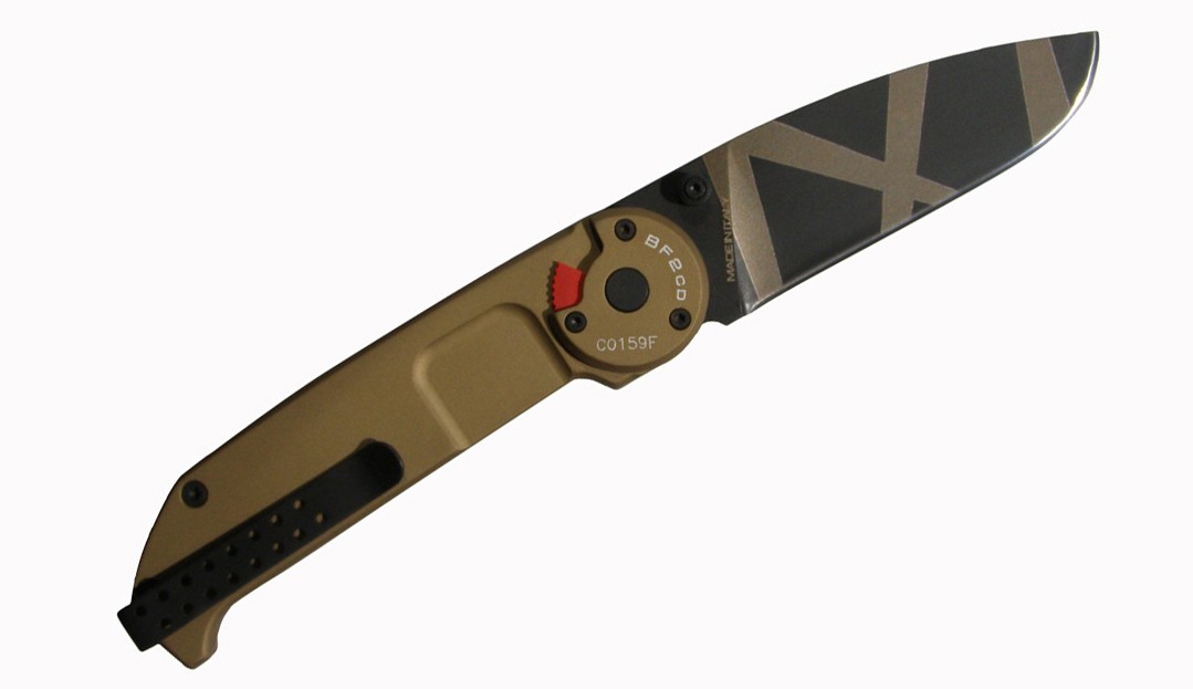 Navaja diseñada para uso táctico-militar, construida en acero N 690 acabado en Desert warfare, con cachas de anticorodal (aleación de aluminio) en color arena y clip reversible. Filo liso, botón de apertura y hoja "Drop Point”, con bloqueo mediante liner lock y seguro manual.