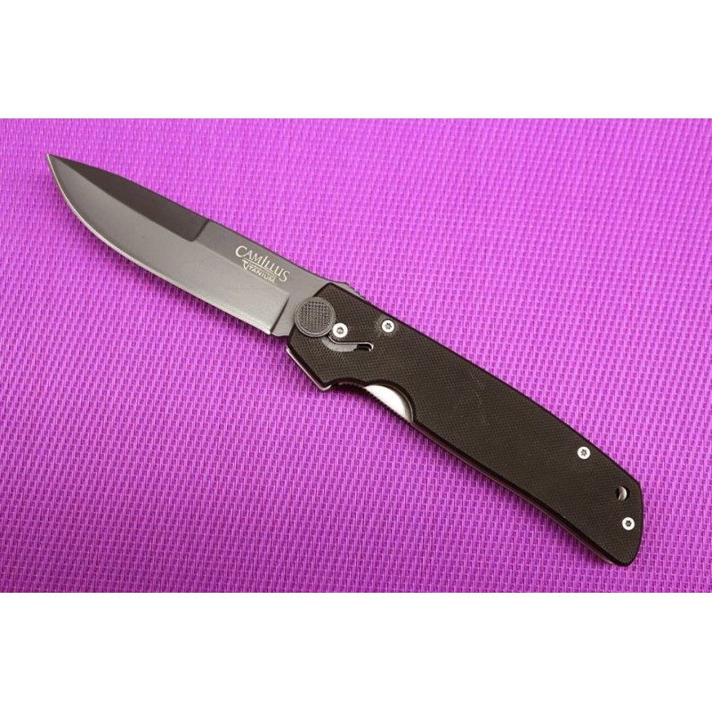 Camillus Cuda Folding Knife with Quick Release. 4 1/2" closed. Carbonitride Titanium Japanese AUS-8 stainless hollow ground blade. Quick action blade release. Ergonomic G-10 fiber handles. Lanyard hole