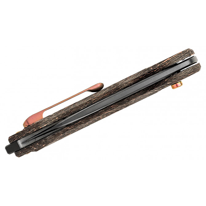 Para el diseño de esta navaja se ha optado por el perfil Sheepsfoot. Consiste en un filo recto durante todo el recorrido, y en el caso del lomo permanece paralelo hasta que cerca de la punta hace una curva convexa.