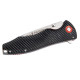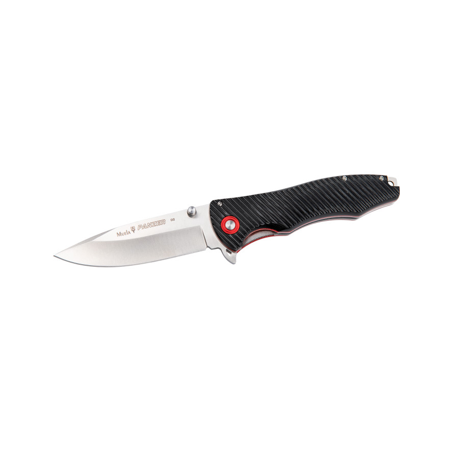 Otro de los acabados del modelo Panzer, fabricado en 2024 por Muela es la Panzer-10BM, con hoja drop point de acero al carbono D2. El mango que le han incorporado está fabricado en micarta negra moldeada, para un buen agarre, con agujero para cordón fiador. Incluye funda de cordura y bloqueo Liner Lock.