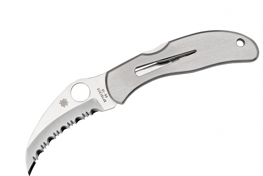La Harpy de Spyderco es como la garra de un águila arpía. La hoja hawkbill de acero inoxidable está completamente serrada para el corte de materiales fibrosos como cuerda, cinturones, etc. La navaka viene con un clip de bolsillo para llevar la punta hacia abajo.