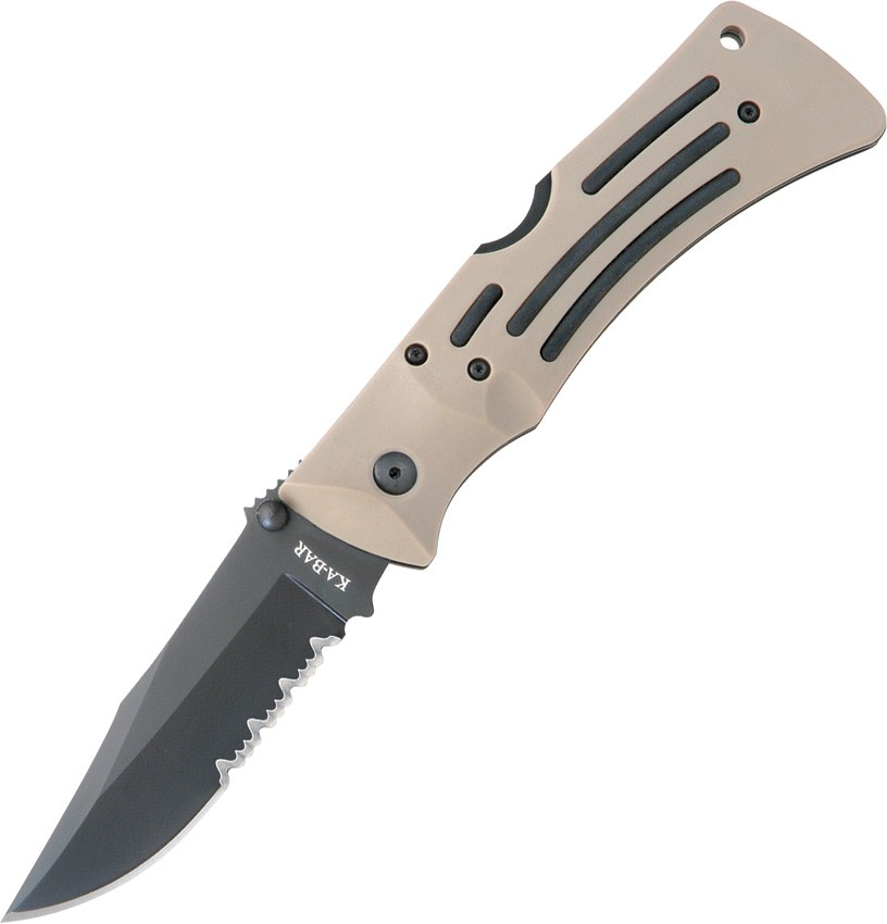 Ka-bar MULE Part Serr. 5 1/4" closed lockback. Black epoxy powder coated AUS-8A stainless partially serrated clip blade with ambidextrous thumb studs. Desert Zytel handles with black rubber inserts. Lanyard hole. Desert nylon belt sheath than can be worn vertically or horizontally.