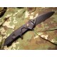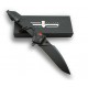Navaja de la serie MF. Construida en acero N 690 acabado en negro y cachas de anticorodal color negro, con botón de apertura y clip ambidextro. Liner lock y bloqueo manual con forma hoja similar al modelo Shrapnel. Rompecristales.