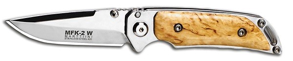 The blade and robust body of the knife are made from stainless steel 420. The handle parts are made from a beautiful Finnish curly birch. MFK folding knives are delivered in a metal gift box.