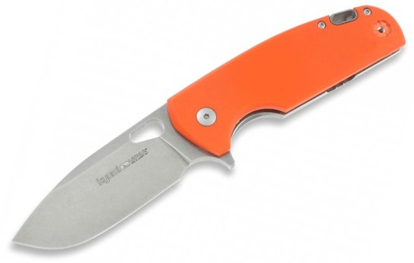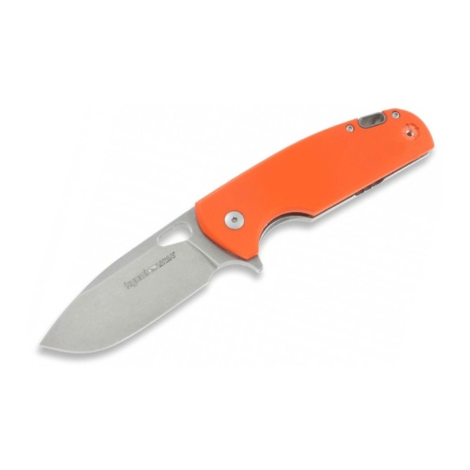 Navaja fabricada con acero N690 con cachas en G10 naranja, con bloqueo FrameLock.
