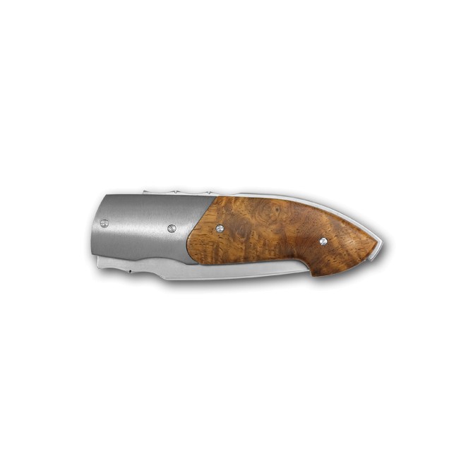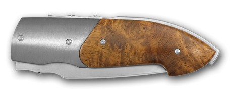 Navaja fabricada con acero 440A con cachas en raiz de Amboina, con bloqueo liner lock y virola en titanio