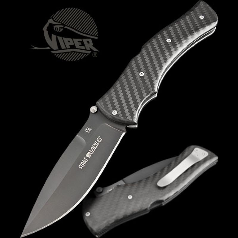 Navaja fabricada con acero D2 pavonada negro con cachas en fibra de carbono, bloqueo Back Lock. Incluye clip para portar en el cinturón.